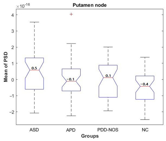 As the first step in a statistical significance test, the mean PSD values of BOLD signals from 116 brain regions are determined as the input to group-level statistical significance tests. Results of the p-value are tabulated in Table A1, under Appendix A. From the p-value, it can be revealed that putamen_R node is the most significant node in discriminating the 3 ASD classes and NC. The location of putamen_R node, the 2nd (caudate nucleus_L) and 3rd ranked nodes (superior temporal gyrus_L), are shown in Figure 4. Further analysis on the PSD values of putamen_R node is shown as a boxplot in Figure 5. From the boxplot, it is clear that the PSD value is the highest for ASD among the 4 groups, while the lowest is for NC. These results indicate that there is significant variation of PSD based on putamen_R activity.