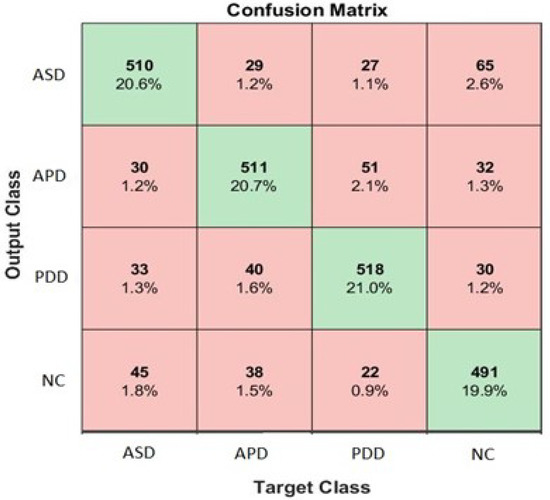 In the last experiment, the proposed model is trained for multi-class classification of 3-level ASD and NC taking scalogram images for four groups as its input. To evaluate the performance of the proposed CNN model, the scalogram data is divided into 0.7 as training dataset, 0.15 as validation dataset and 0.15 as testing datasets. The rest of the training parameters are the same as in Section 3.2. The proposed CNN is trained using ADAM, SGDM, and RMSPROP optimizer and the results for each optimizer are presented in Table 7. The best performance is achieved by the proposed CNN with ADAM optimizer giving macro-average accuracy 82.1%. Detailed performance of each class is presented in the confusion matrix, as shown in Figure 6. It is worth highlighting that to date, the ASD subtypes classification has not been done in literature so in this first attempt, with macro-average accuracy 82.1%, there are still opportunities for further enhancements to the classification algorithm.