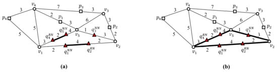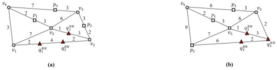 Here, we consider five SP queries , and in a spatial network (Figure 4). Assume that the NN queries , , and find a data point closest to themselves and that the RN queries and find data points within query distance ) to themselves.