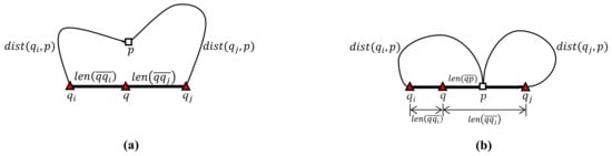 Figure 6 illustrates the computation of the distance between query point q in query segment and data point p for the following cases: and . As shown in Figure 6a, when data point p is outside query segment , i.e., , the distance from q to p is given as because the shortest path between q and p is either or . As shown in Figure 6b, when p is inside , i.e., , the distance is given as because the shortest path between q and p is governed by one of the following three cases: , , or .