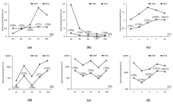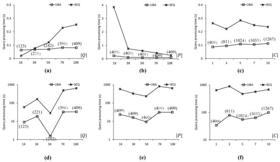 Figure 7d–f show the query processing times of UBA and SEQ when the data points followed a centroid distribution. The query processing times of the proposed UBA were up to 18.95 times lower than those of SEQ for all cases. Unlike the case shown in Figure 7a, the query processing times of UBA and SEQ did not increase with , as shown in Figure 7d, which means that the query processing time was more sensitive to the distribution of data points than when the data points followed a highly skewed distribution. When , , , , and , the query processing times of UBA were 21.7, 162.8, 21.9, 126.8, and 468.7 s, respectively. As shown in Figure 7d–f, UBA was faster than SEQ in all cases. The difference in query processing times between UBA and SEQ for a centroid distribution of data points was up to several orders of magnitude greater than that for a uniform distribution of data points.