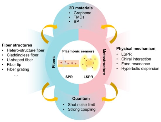 An overview of this review, the center is the sensing mechanism of plasmonic sensors.