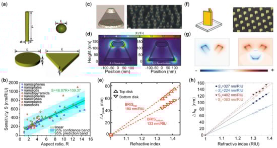 The variation of background permittivity will lead to the spectral shift (correspondingly for wavelength) of LSPR, which is the basic sensing mechanism [62]. Recently, Khan et al. [63] systematically measured and analyzed the sensitivities of a group of LSPR structures (Figure 2a). They found that the aspect ratio of various nanoparticles had strong correlations to the sensitivity as shown in Figure 2b. This comprehensive study can be served as a guideline for nanoparticle synthesis and fabrication of highly sensitive nanomaterials.