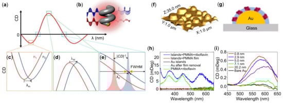Plasmonic chiral sensors. (a) Circular dichroism (CD) spectra of a plasmonic enantiomer. (b) Illustration shows the interaction between a left-handed nanohelix and circularly polarized light. Three bottom panels indicate the resonance shifts at (c–e) where the RI of the surroundings are varied from and . (f) Atomic force microscope (AFM) images of gold-island films. (g) Scheme of gold islands covered with polymers which includes embedded riboflavin molecules. (h) CD spectra for different hybrid plasmonic structures. (i) CD spectra from Riboflavin derivative with different separation from the gold surface, together with a bare gold CD spectrum. Reprinted (a–e) with permission from Reference [91]. Reprinted (f–i) with permission from Reference [92].