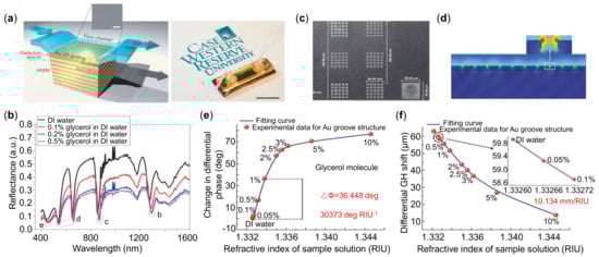 HMM-based plasmonic sensors. (a) Schematic of the miniaturized HMM sensing device (left). Photograph of the fabricated sensors (right). (b) Measured reflectance spectra of the HMM device obtained by different concentrations of glycerol. (c) SEM images of the nanogroove hyperbolic metasurface. (d) Resonant electric field distribution on the nanogroove surface. (e) Differential phase change of the reflected light related to the concentrations of glycerol solution. (f) Differential Goos–Hänchen (GH) shift with respect to the concentration of glycerol solution. Reprinted (a,b) with permission from Reference [31]. Reprinted (c–f) with permission from Reference [100].