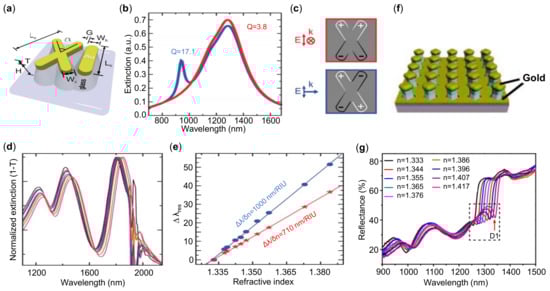 The interference of the radiant and subradiant LSPR modes is usually realized by structural symmetry breaking and the optical field coupling among multiple metallic elements. In plasmonic sensors, Wu et al. studied an infrared asymmetric metamaterial based on Fano resonance [109]. They investigated the structural/spectroscopic and binding properties of monolayer protein by precisely tuning the structural resonance towards (away from) the target vibration resonance. The potential for multispectral biosensing was also demonstrated. Verellen et al. reported a combined nanocross and nanobarn structure as shown Figure 6a [110]. When the structure is illuminated at grazing incidence, the hybrid structure demonstrates an extra sharp resonance around 950 nm wavelength (Figure 6b), which is the dark quadrupole mode coupled weakly to dipolar radiation. The charge density plots in Figure 6c clearly illustrate the dipolar (red box) and quadrupolar (blue box) nature of the modes. In Figure 6d,e, RI sensitivities exceeding 1000 nm/RIU with a FOM reaching 5/RIU in the NIR are obtained.