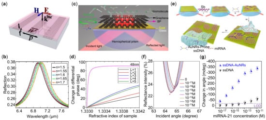 (a) Illustration of graphene ribbons. (b) Reflection spectra for graphene ribbons covered with different dielectric films at a constant thickness of 2 nm. (c) Schematic diagram of graphene–black phosphorous (BP) surface plasmon resonance (SPR) biosensor. (d) The change in differential phase with the variation of RI. (e) Fabrication process diagram of miRNA sensor integrated with antimonene nanomaterials. (f) Reflection spectra shift for different miRNA-21 concentrations assisted by AuNRs amplification. (g) SPR angle shift versus the miRNA-21 concentration. Reprinted (a,b) with permission from Reference [166]. Reprinted (c,d) with permission from Reference [168]. Reprinted (e–g) with permission from Reference [169].