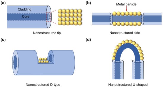 Schematic of typical structures used for fiber-LSPR sensors. (a) Plasmonic nanostructures on fiber tip, (b) Fiber side wall, (c) D-type fiber, (d) U-shaped fiber.