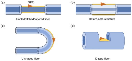 where denotes the refractive index of the analyte. The propagation of light in fiber is based on total internal reflection, and when the propagation constant is equal to , the SPR can be efficiently excited which is quite similar to the Kretschmann configurations. Compared with the prism-based SPR sensors, the optical fiber-SPR structures have the advantages of easier tuning and smaller bulk size. Note that the optical fibers have cylindrical shape and the optical modes possess spatially varying 3D-optical field; thus, only part of the energy inside the core can couple with SPR mode [177,195]. Overall, the design of fiber-SPR sensors includes mainly two steps: The first is modifying the shape of fiber such as removing the cladding, bending the fiber and grinding the fiber side or fiber tip to a certain angle; the second step is the metallic coating [177,196,197,198]. The former step supports the evanescent field escaping from the core of fiber to excite the SPR mode, the latter step greatly enhances the light-matter interaction.