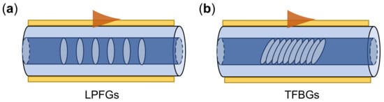 Schematics of the optical fiber grating-assisted SPR- fiber sensors. (a) Long period fiber gratings (LPFGs), (b) Tilted fiber Bragg gratings (TFBGs).