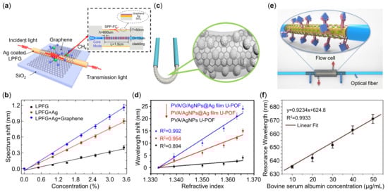 Wei et al. [229] demonstrated a graphene-based LPFG-SPR sensor for high-sensitivity gas sensing as shown in Figure 11a. A metal film coated on the LPFG will enhance the surface optical field; however, it cannot adsorb molecules effectively. The graphene coating benefits for both the localized electromagnetic field and molecule adsorption efficiency. In Figure 11b, the graphene-based LPFG-SPR sensors have the best sensing performance, and the sensitivity is improved by 2.96 (1.31) times compared to a bare LPFG sensor (Ag-coated LPFG sensor). Jiang et al. [194] presented a U-shaped plastic optical fiber-SPR sensors based on graphene and silver hybrid structure as shown in Figure 11c. The U-shaped fiber deposited with graphene/Ag NPs/Ag film have an obviously higher sensitivity of 700.3 nm/RIU thanks to the biocompatibility and electric field enhancement of graphene. The TMD nanosheets hold great potential in biosensing applications for their large surface area and interaction with biomolecules [237]. Kaushik et al. [234] reported a MoS-assisted biofunctionalized fiber-SPR biosensor as illustrated in Figure 11e. The antibodies were used for label-free detection of bovine serum albumin (BSA) protein. The fiber sensing performance with MoS is better than the one without MoS. The synergic effects of MoS and gold film amplified the SPR signals with an improved detection limit of 0.29 g/mL. Note that in most cases, 2D materials in plasmonic fiber sensors act as protecting layers accompanied with enhanced the adsorption efficiency and electromagnetic field. However, the improvement in sensing is not competitive and most of them are limited in the theoretical calculations.