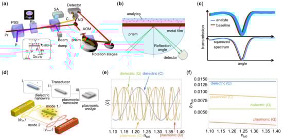Quantum resources have revolutionized the metrology in the field of quantum-enhanced sensors, in which the amplitude or phase squeezed light are widely used [240,241,242,243]. Pooser et al. [241] reported a heterodyne-based quantum plasmonic sensors as shown in Figure 12a. They realized a maximal quantum noise reduction of approximately 4.5 dB by combining the twin quantum correlated light fields with conventional Kretschmann geometry in Figure 12b. Note that the two-mode squeezed state was produced by pumping Rb vapor with degenerate four-wave mixing effects (inset of Figure 12a) [241,244]. Since the squeezed light can significantly reduce the shot noise, the sensing resolution is improved as illustrated in Figure 12c. Later, Lee et al. [245] studied two-mode beams with symmetric quantum statistical features combined with a SPR sensor, which notably enhanced the estimation precision of RI of the analytes. Zhao et al. [246] demonstrated an optical salinity quantum sensors in a tapered hetero-core plasmonic fiber. They realized a salinity sensitivity of 0.02204/‰with a ultra-resolution of 0.0016‰, exhibiting one order of magnitude higher than that of traditional optical fiber-SPR sensors.