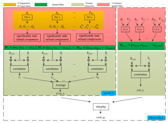 Since CCA have the ability to maximize the covariance between sine-cosine reference signals and EEG data, a combined mc-TRCA (CB-mc-TRCA) method was proposed. It combined CCA-based spatial filter and TRCA-based filter together. The correlation analysis based on CCA is calculated as: