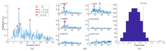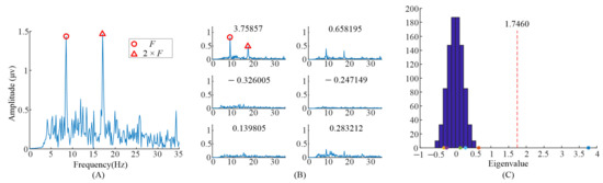 When we applied TRCA based on Equation (1) to the EEG data, six eigenvalues and eigenvectors were obtained. Figure 2B illustrates the spectrums of task-related components (). The corresponding eigenvalues were at the upper left of the subgraph in Figure 2B. It can be clearly observed that the peaks in the spectrums with different eigenvalues were different. The peaks, in the spectrum with eigenvalue 2.18697, were at and . The peaks, in the spectrum with eigenvalue 1.2284, were at and . Finally, the peaks, in the spectrum with eigenvalue 1.04008, were at and . Figure 2C illustrates the eigenvalues’ distribution computed with randomized task onsets (blue bars) and original eigenvalues (asterisk). The vertical dashed line indicates the 99% confidence interval; there were three eigenvalues on the right side of the vertical dashed line. This indicated that these three components were statically significant, i.e., corresponding task-related components as described before were significant.