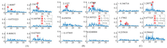 For the EEG data responding to the right stimulus, the up stimulus, and the bottom stimulus, the spectrums of task-related components () were obtained as shown in Figure 3. The induced frequencies were also distributed in different components. For the right stimulus target ( = 12 Hz, = 0.75 Hz), there were three significant task-related components, as shown in Figure 3A. The peaks at and occurred in the spectrum of the first significant task-related component (corresponding to eigenvalue 1.46007). The peaks at and occurred in the spectrum of the second significant task-related component (corresponding to eigenvalue 1.33675). The peak at occurred in the spectrum of the third significant task-related component (corresponding to eigenvalue 0.627603).