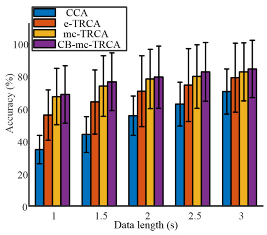 The mixed effect model of analysis of variance (ANOVA) was used for statistical analysis. Participant was used as the random factor. Data length (1, 1.5, 2, 2.5, 3) and method (“1”: CCA, ”2”: e-TRCA, “3”: mc-TRCA, “4”: CB-mc-TRCA) were used as fixed factors. Accuracy value was the response variable. The Bonferroni post hoc analysis was used to assess significance. The statistical significance level was 0.05.