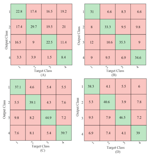 The classification confusion matrices average from all the subjects. (A) CCA-based method; (B) e-TRCA method; (C) mc-TRCA method; (D) CB-mc-TRCA method.
