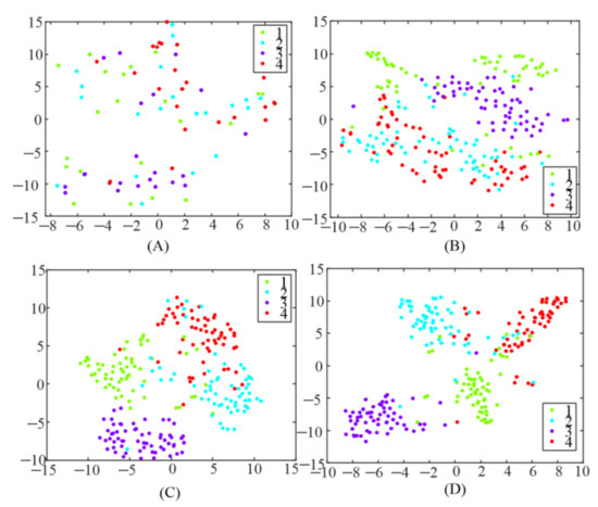 Feature visualization using t-SNE. (A) The correlation coefficient after utilizing CCA-based spatial filter; (B) the correlation coefficient after utilizing e-TRCA-based spatial filter; (C) the correlation coefficient after utilizing mc-TRCA-based spatial filter; (D) the correlation coefficient after utilizing CB-mc-TRCA-based spatial filter.