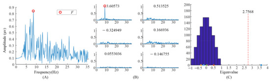 Analysis of the eigenvalues and task-related components in the EEG data when S6 gazed at the flicker stimulus. (A) The spectrum of the averaged EEG data; (B) the spectrums of task-related components; (C) the eigenvalue distribution using randomized task onsets.
