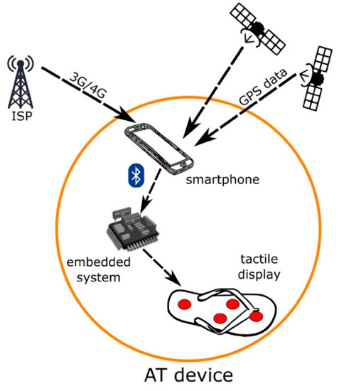 Figure 1 illustrates how a blind or low vision pedestrian would use the AT device. The smartphone is responsible for user GPS coordinate acquisition as well as for running the navigation software that generates the instructions to reach a destination. Navigational instructions are then transmitted to an electronic module that the user comfortably wears attached to the ankle. Such module translates the instructions to actuator commands and sets the tactile display accordingly. In sum, the user feels vibrations in the foot sole pointing the direction to follow.