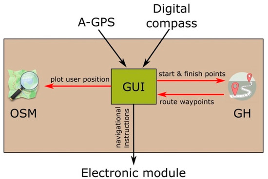 A dedicated Android-based app was implemented to link all the navigation software of the AT device. Such app encompasses three main elements (Figure 3): (1) The OpenStreetMap (OSM) API (application programming interface) [39], (2) the Graphhopper (GH) API [40], and (3) a self-developed script. OSM is a collaborative project that aims to create free-to-use maps of the world. Graphhopper is an open-source route planner that allows computing the shortest pedestrian route between two points. The script serves as graphical user interface (GUI), links the two former APIs, and generates the instructions for the tactile display.