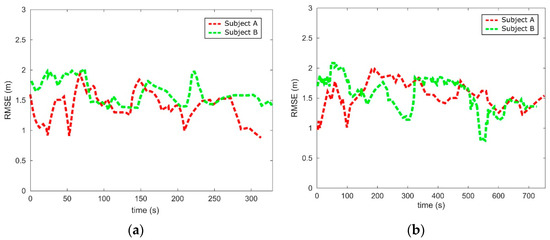 The RMSEs observed during the navigation tasks are shown in Figure 13. Figure 13a shows the time-evolution of the RSME for E-1. An approximate 0.9 to 2 m A-GPS accuracy was observed during the task. Figure 13b shows the time-evolution of the RSME for E-2. A similar A-GPS accuracy range was obtained. Note that, despite having performed the same task with the same GPS receiver and 4G network, the time-evolution of the RMSEs is notably different between the subjects. This is due to the satellites position and atmospheric conditions that might have changed deriving from performing the task in different days.