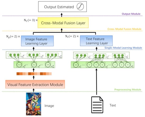As shown in Figure 2, the operation through Equations (5)–(7) is called a feature learning layer which can get feature representation of the text or image. We stack multiple feature learning layers to obtain a single-modal feature learning module, so as to obtain the representation of the single-modal feature.