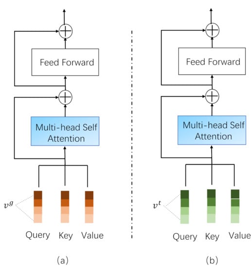 The multi-head self attention mechanism [20] can help to learn subtle feature information in the single-modal feature, and each “head” can be regarded as a subspace. Taking the text feature as an example, in the h-th feature subspace, the similarity between the Text Embedding Vector and the Text Embedding Vector can be calculated as