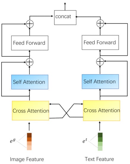 In Equation (8), is a normalization function, is the dimension of , and represents that the relationship between two modal feature is learned through the inner product. In the same way, we can use the text feature to calculate the cross-modal weight of the image feature , and obtain the image cross representation using and :