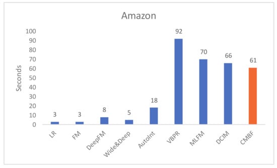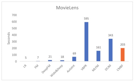 We compare the run time per epoch of CMBF and other algorithms, as shown in Figure 4 and Figure 5. Obviously, the run time of LR and FM is shortest because they do not use a deep network. The single-modal algorithms (i.e.; DeepFM, Wide&Deep, AutoInt) require less run time than multi-modal algorithms with worse performance of prediction results. Note that compared with other mult-modal algorithms (i.e.; VBPR, MLFM, DCIM), our CMBF does not require much run time, and its performance is improved, which proves the efficiency of CMBF.
