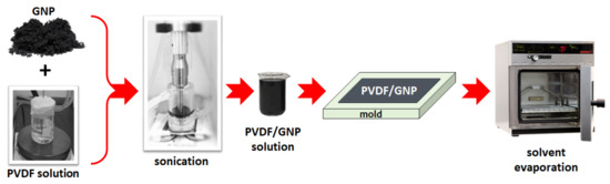 Sketch representing the main steps of the graphene-PVDF nanocomposite films production process.