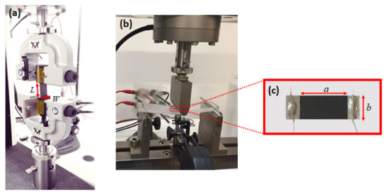 (a) Mechanical measurement test setup. Each rectangular strip has dimensions: L (gage length) = 5 cm and W = 2 cm. (b) Three-point bending test setup; (c) PVDF/GNP nanocomposite sample cut into a rectangular shape (a = 10 mm, b = 5 mm) with contact areas at both extremities.