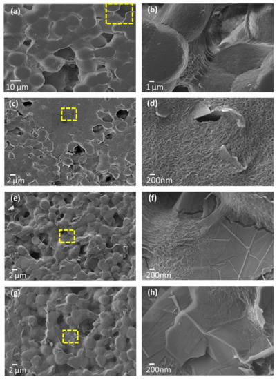 Moreover, when GNPs are added to the polymer, the films exhibit a marked decrease in porosity, as compared to the unfilled neat PVDF. Indeed, previous studies have shown that GNPs can trigger the nucleation of the β phase within the matrix, by constraining the polymer chains to orient in such a way as to promote this electroactive phase formation and to close pores [39,40]. As a consequence, as the GNP concentration is increased, PVDF composite films gradually turn from an initially semi-spherulitic structure to a more compact morphology. In particular, looking at Figure 4c,e,g and at the corresponding higher magnification micrograph (Figure 4d,f,h), it is clear that most of the original porosity has been reduced by the presence of GNPs.