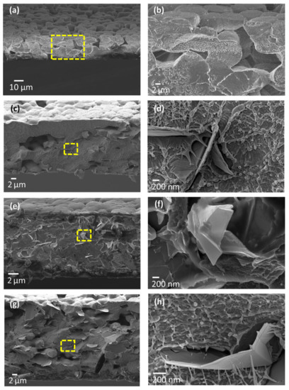 SEM images of cross sections of (a,b) neat PVDF and PVDF nanocomposite films filled with 1 (c,d), 1.5 (e,f), and 2% wt (g,h) of GNPs.