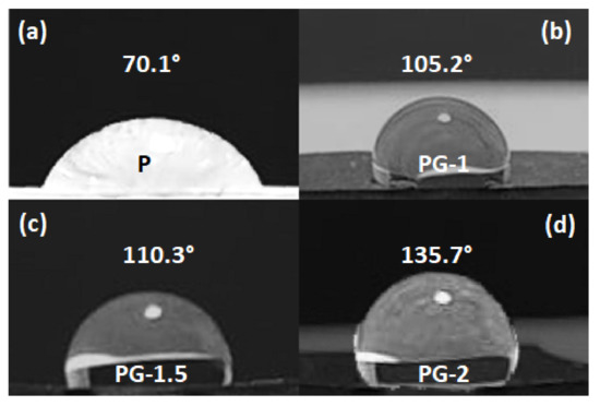 Contact angle images of sample P (a) and GNP-filled samples PG-1 (b), PG-1.5 (c), and PG-2 (d).