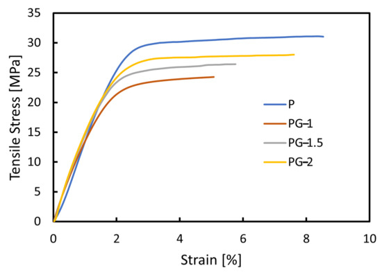 The measured tensile stress-strain characteristics of samples P, PG-1, PG-1.5, and PG-2 are reported in Figure 7.
