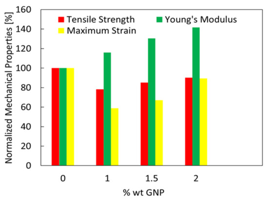 Normalized tensile strength, Young’s modulus, and maximum strain for different GNP weight fractions.