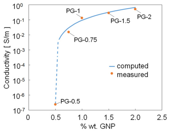 The best fit with the measured electrical conductivity values is obtained by setting θc [%] = 0.55% wt, τ = 2.6, and K = 1870 S/m. Note that also samples PG-0.5 and PG-0.75 have been considered in order to evaluate the percolation threshold, even though they are not suitable for the realization of graphene-based strain sensors due to the low GNP amount.