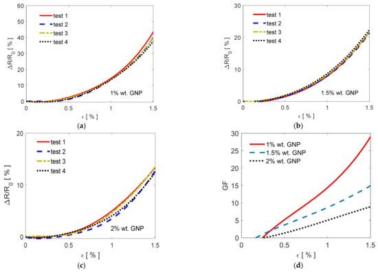The piezoresistive behavior of samples PG-1, PG-1.5, and PG-2 is analyzed in Figure 10a–c under a quasi-static flexural loading. The graphs show the relative resistance change ΔR/R0 versus the applied flexural deformation ε. The corresponding GFs are reported in Figure 10d.