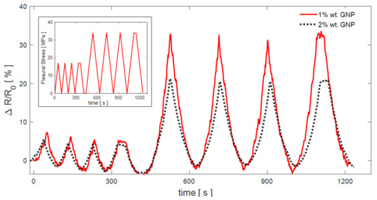Figure 11 reports the measured relative resistance change ΔR/R0 of samples PG-1 and PG-2 due to the applied flexural stress variations. The figure inset shows the imposed flexural stress with respect to time. It is worth noting that the measured relative resistance changes ΔR/R0 are consistent with the imposed flexural stress and that the resistance variation is more evident for the 1% loaded sample, as expected with GF being much higher.