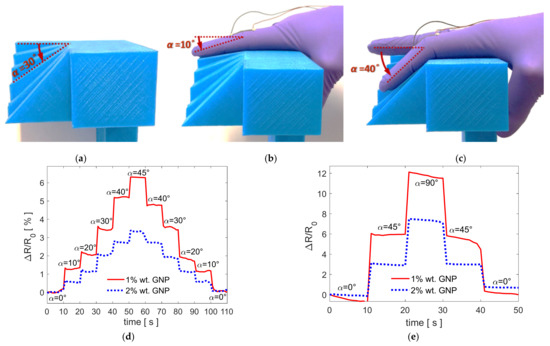 Looking at Figure 12d,e, it can be stated that both the realized sensorized gloves are able to detect even small proximal interphalangeal joint movements of the index finger since the measured ΔR/R0 profiles perfectly reproduce the index finger flexion movements. Moreover, it is noticed that the obtained data are repeatable and consistent and when the proximal interphalangeal joint is no more flexed the resistance assumes its initial value. Then, the resistance change is more evident for the sensorized glove realized with the PVDF nanocomposite film filled with 1% wt of GNPs, as expected with GF being much higher. However, it is worth noting that also the sensorized glove realized with the nanocomposite film filled with 2% wt of GNPs, characterized by higher waterproofness, is suitable for movement detection.