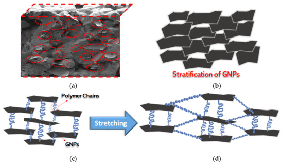(a) SEM image showing GNP horizontally aligned and (b) corresponding schematic representation. Conducting network formed by the horizontally aligned GNPs under (c) normal or (d) stretching conditions.