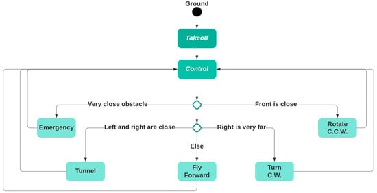The high-level control algorithm role is to select the next state from the five possible states (Rotate C.C.W., Emergency, Tunnel, Turn C.W., Fly Forward), each time the control state is reached (see Figure 3).