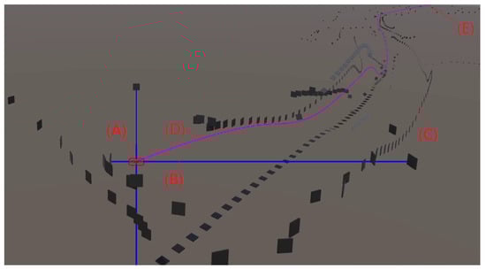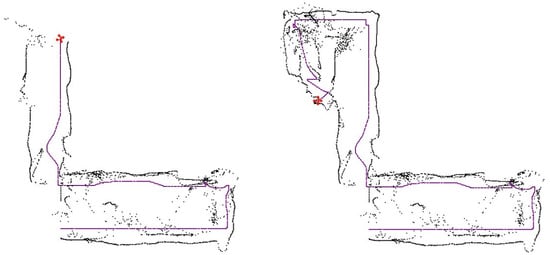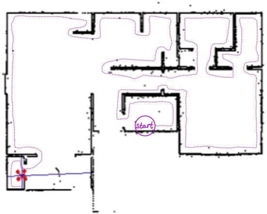 The 2D visualization is a top-down view of the environment (see Figure 4 for an example). This visualization is easier to understand, but it does not represent the objects’ and obstacles’ heights. Once the mapping station receives BAT’s map, an offline loop-closure algorithm (see [,]), can be used to improve the map and reduce the drifts—on the mapping station side.