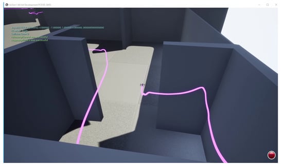 Figure 6 presents a screenshot of the simulation. The simulated BAT successfully flew in the simulator without colliding with obstacles, and managed to explore a complex building with an area of 600 m over a period of 5 min, see in [] for the complete BAT simulation.
