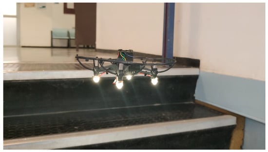 The optical flow present in the Tello drone requires at least 100 lumens per square meter (lux) in order to function properly; this may be challenging in a dark environment. The optical flow is not only used for obtaining measurements required by the mapping, but a lack in lighting conditions may cause the drone to drift even when not receiving any commands from the microcontroller. Furthermore, the Tello drone does not accept any commands from the microcontroller in poor lighting conditions. Therefore, we added 4x down-facing LEDs to BAT’s legs in order to provide additional lighting; in practice, the LEDs provide enough light even in an absolutely dark environment.