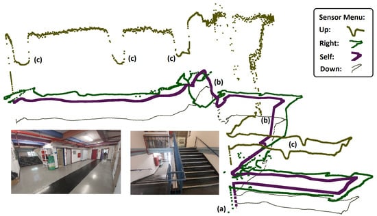 A 3D mapping of a two story building. BAT’s up, right, down and self position sensor-ranging are shown in brown, green, black and magenta lines, respectively. BAT’s starting point is marked by (a), (b) marks the stairs to the second floor—as shown in the lower right image. Changes in the ceiling height are marked by (c).