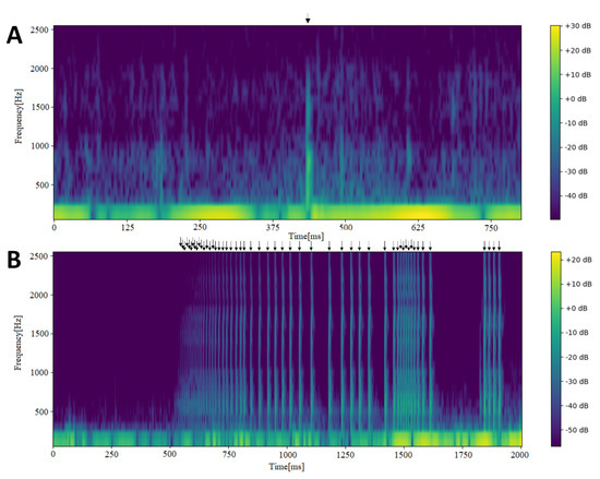 Spectrograms depicting bowel sounds recorded using a contact microphone in the right lower quadrant of the abdomen. (A) An individual short bowel sound is clearly discernible in the middle (~425 ms; indicated by the arrow at the top). The signal below 250 Hz is composed of venous hum and heart beats. (B) A series of over 50 bowel sounds (arrows) occurring in less than 1.5 s.