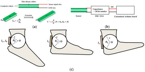 (a) Structure and principle of the flexible sensor. The sensor consists of two conductive fabric pieces as electrodes and a thin silicone rubber dielectric layer. A change in the length of the sensor causes a change in the capacitance level, and measuring the capacitance level is the operating principle of the sensor. (b) Entire circuit of the flexible sensor system. The FDC 2214 board changes the capacitance value to a 28 bit digital number. The Arduino board displays a digitized number. (c) Conversion of ankle angle to strain of the sensor. We assumed that the sensor is extended by the cylindrical behavior of the ankle angle.