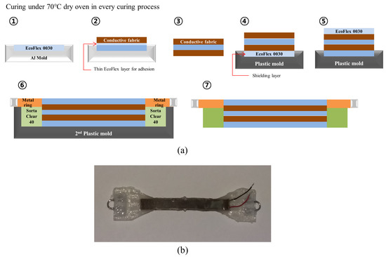 (a) Sensor fabrication process. Curing was performed at 70 ℃ for 10 min in drying oven in every curing process. (b) Fabricated sensor.